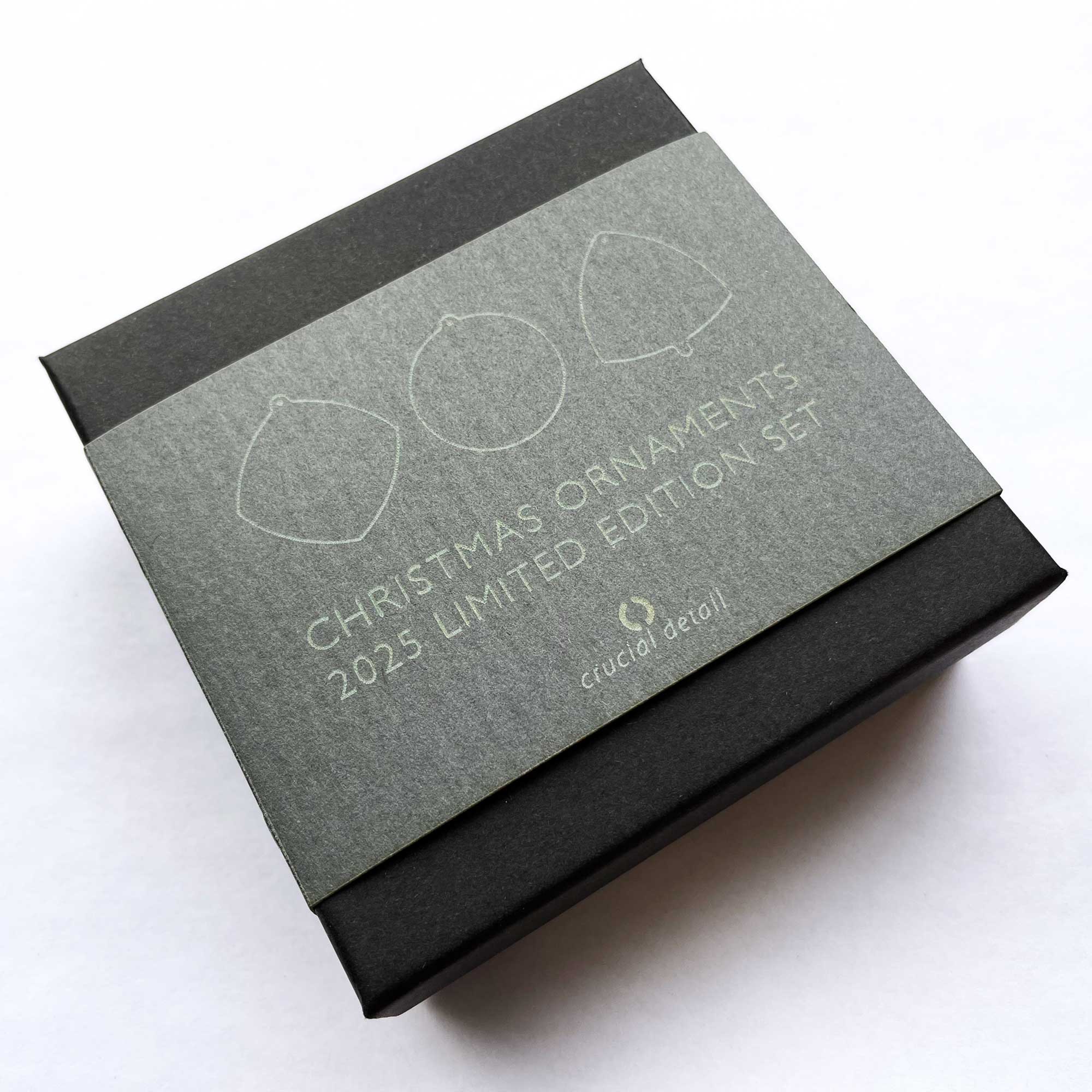 From those experiments came a set of Christmas ornaments. We’re producing a very limited edition run for this holiday season. It ships as a set of three, one of each shape, in a handsome gift box.